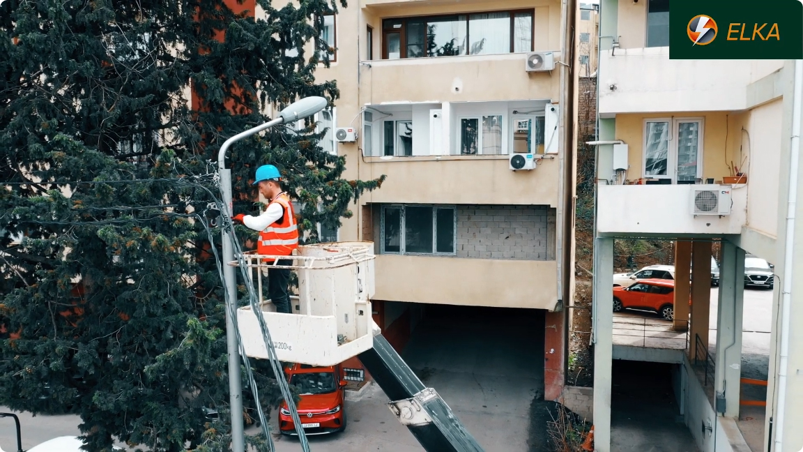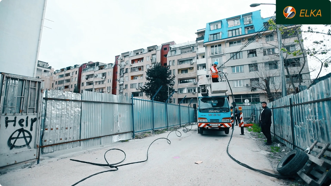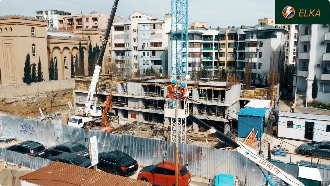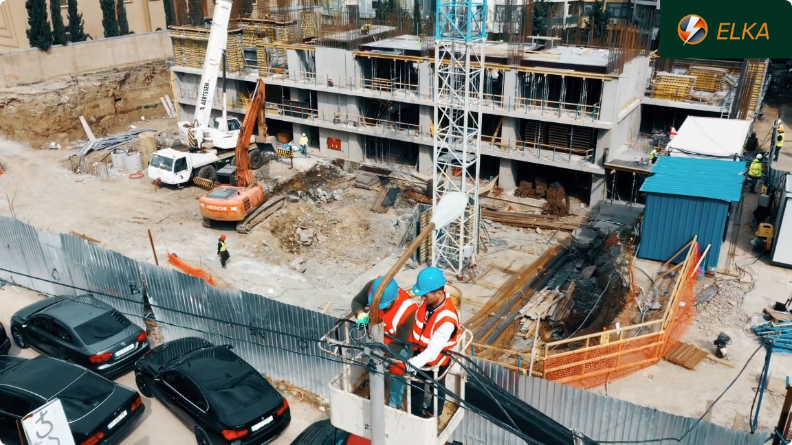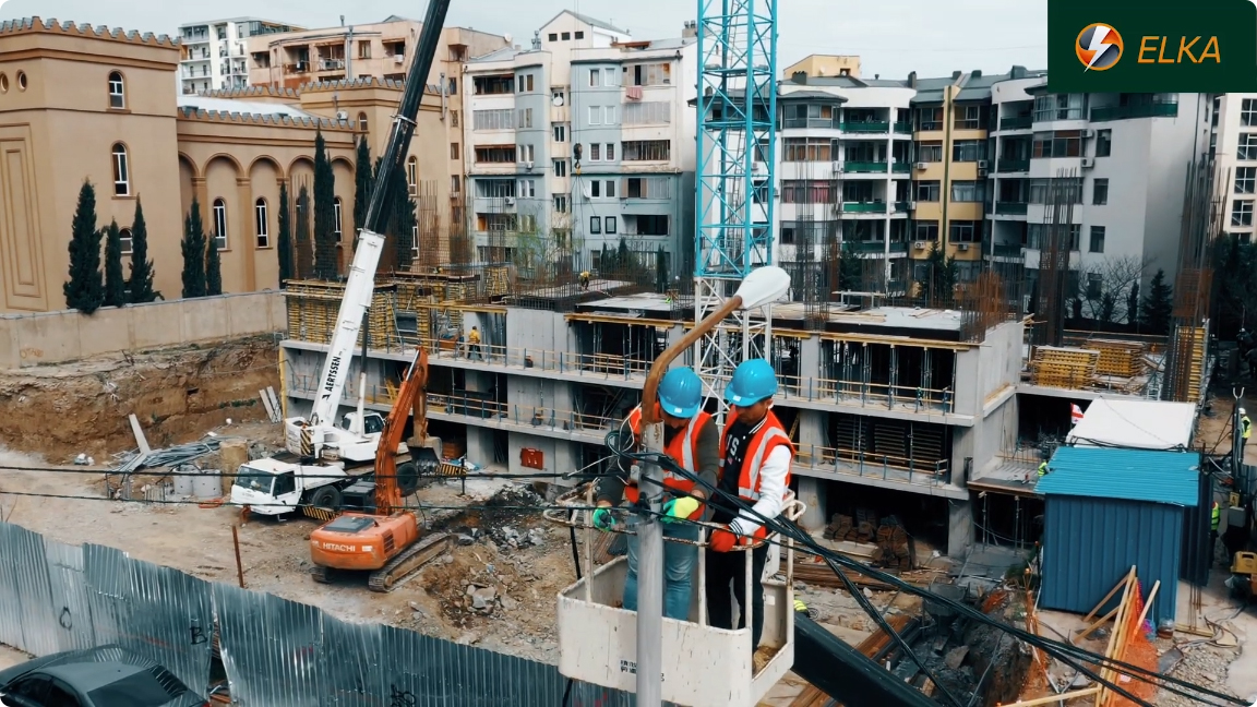 ვიმყოფებით იქსორ დეველოპმენტის მრავალბინიანი კორპუსის სამშენებლო ობიექტზე, სადაც ვასრულებთ დროებითი მშენებლობისთვის საჭირო სიმძლავრის მიწოდების სამუშაოებს. მონტაჟდება სიპ სადენი, გამანაწილებელი კარადა და ეწყობა დამიწების კონტური, რის შემდეგაც ძაბვა მიეწოდება სტაციონალურ ამწეებს. დამკვეთის მოთხოვნოთ სამუშაოები სრულდება უმოკლეს ვადებში.